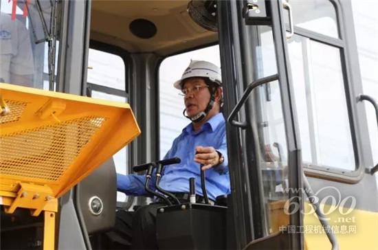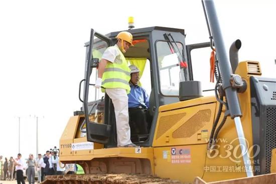 上图:柬埔寨王国首相洪森在开工仪式上致辞并开动设备,亲手启动项目建设。