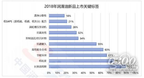 《白皮书》显示,从 2018 年汽机油新品上市的情况看,汽机油产品的技术趋势主要集中在“长换油周期”、“低粘度(OW-)”、“环保”、“高性能全合成”等方面。据统计,2018 年,85%以上的新品上市都主打着这些标签。