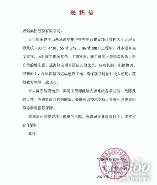 宝钢股份有限公司生产管制中心给威创发来的表扬信