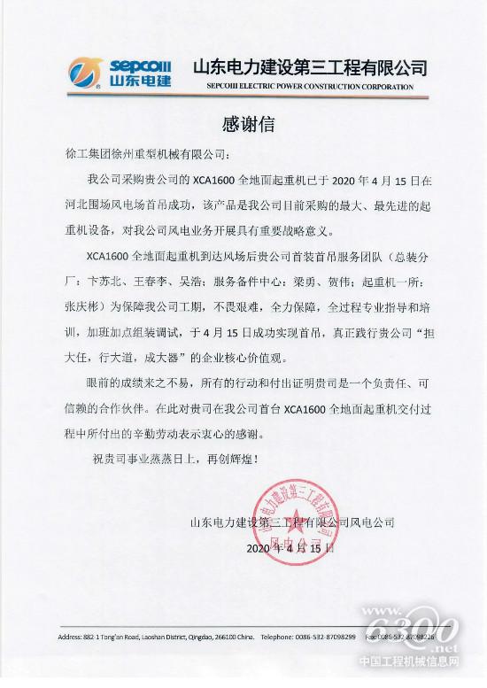 作为XCA1600落户的首家央企,山东电力建设第三工程有限公司专注能源工程建设35年,是国家大一型建筑安装综合型施工企业,先后七次荣获中国建筑业最高奖“鲁班奖”。一个是“最强擎风者”,一个是“能源工程专家”,徐工XCA1600与山东电建强强联手,必然珠联璧合般碰撞出“中国制造”、“中国速度”再升级的绚丽火花,为全面复工复产增添动能,更为社会持续稳健发展蓄满新力。