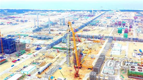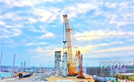 近日,古雷炼化一体化项目EO/EG装置现场,徐工四千吨级履带式起重机XGC88000将全球最大的千吨级EO/EG装置洗涤塔上段高高擎起,在50米的高空中,上下两段塔体完美合拢焊接,“世界第一吊”再续吊装传奇。