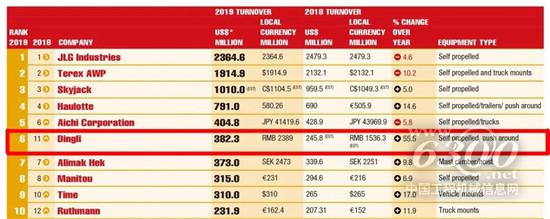 榜单中,浙江鼎力较去年排名大幅靠前,位列第6位。