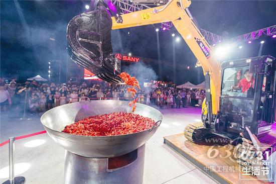 在近千观众的“围观”中,300斤新鲜小龙虾分批次倒入滚烫的锅中。随后,一台2.5米高的三一重工挖掘机化身“厨师”,翻炒龙虾,制作龙虾宴。