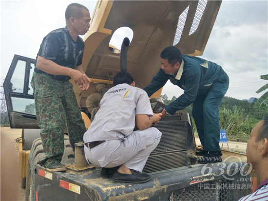 在柳州某地土地平整的现场,多台山推设备参与作业。利用中午休息时间,山推服务工程师为推土机、压路机进行免费检查,和操作手交流日常注意事项。