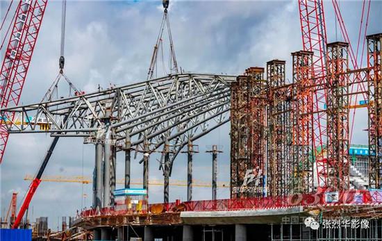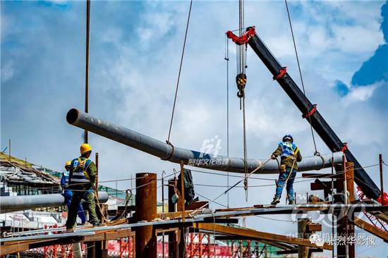先到亚青会场馆看看,体育场馆主体结构拆模完成80%,二次结构首层砌筑完成过半,钢结构吊装立柱完成30根、支座完成10根、格构柱完成21根、胎架完成20根、桁架吊装完成2榀、其他桁架组装中。体育场钢结构吊装:桁架拼装累计完成9榀,桁架吊装完成6榀,贝雷架支撑累计完成44根,地面胎架累计完成20根,钢柱累计吊装30根,柱间支撑杆件累计完成10根。正在建设中的会议中心底板浇筑已经完成80%,二层梁板钢筋完成80%。训练场准备土方开挖。南、北台阶管桩全部施工完成。