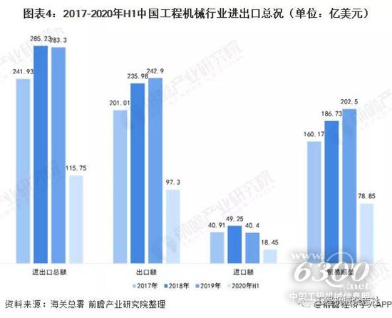 据海关数据整理,2020年1-6月我国工程机械进出口贸易额为115.75亿美元,同比下降18.6%。其中进口金额18.45亿美元,同比下降18%;出口金额97.3亿美元,同比下降18.7%。