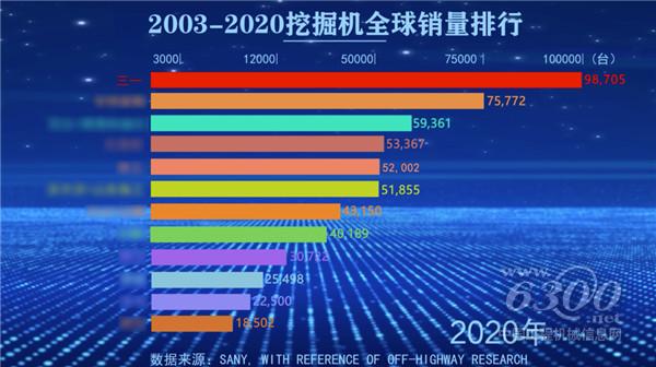 5月31日,中国昆山,“中国力量 世界冠军”三一挖掘机全球销量登顶庆功晚会隆重举行。根据全球权威调研机构Off-Highway Research数据,2020年,三一共销售98705台挖掘机,占据全球挖掘机市场15%的份额,夺得全球销冠!
