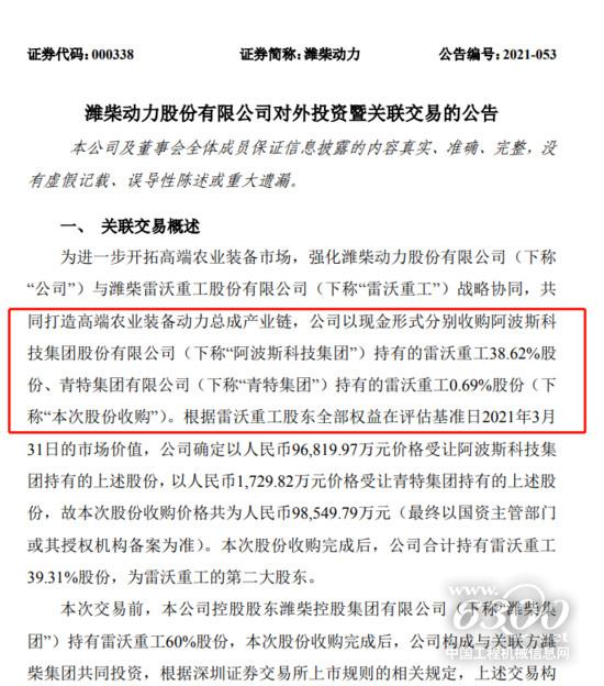 7月13日,潍柴动力发公告称,公司拟以现金形式分别收购阿波斯科技集团持有的雷沃重工38.62%股份、青特集团持有的雷沃重工0.69%股份。股份收购价格共为人民币9.85亿元。本次股份收购完成后,潍柴动力合计持有雷沃重工39.31%股份,为雷沃重工的第二大股东。