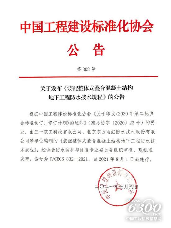 根据中国工程建设标准化协会《关于印发<2020>的通知》(建标协字〔2020〕23号)的要求,由三一筑工科技股份有限公司、北京东方雨虹防水技术股份有限公司等单位编制的《装配整体式叠合混凝土结构地下工程防水技术规程》,经协会防水防护与修复专业委员会组织审查,现批准发布,编号为T/CECS 832-2021,自2021年8月1日起施行。