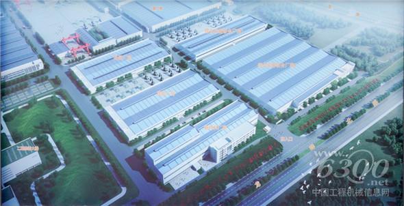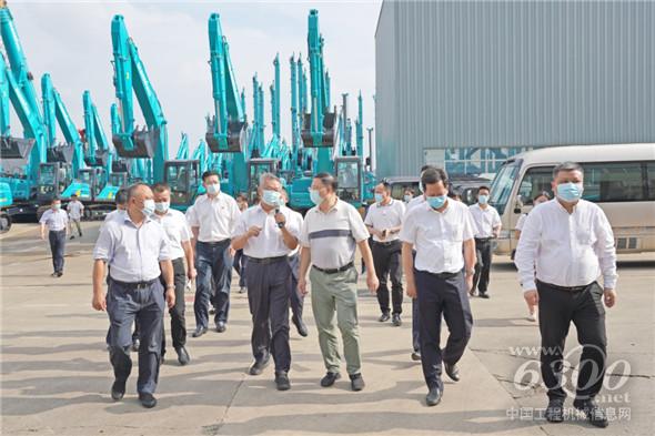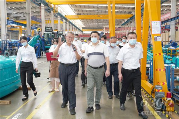 △张剑飞一行来到挖掘机装配车间,参观挖掘机生产装配流程。