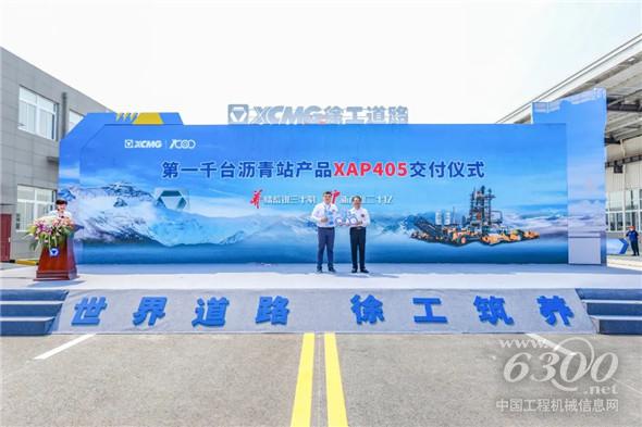 徐工道路机械事业部副总经理王锋将象征着徐工第一千台沥青站的车模交给客户
