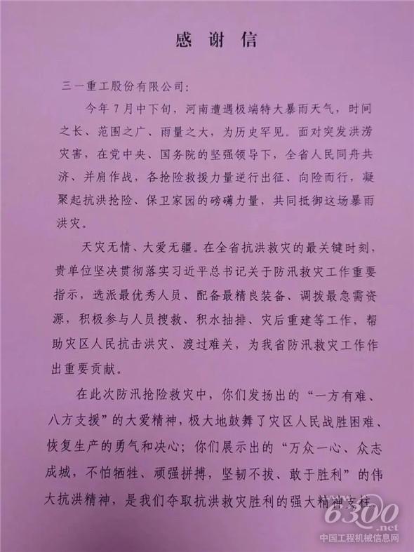 灾后重建工程完成后,为感谢三一重工对河南抗洪救灾做出的重大贡献,河南防汛抗旱指挥部向三一重工送来了诚挚的感谢信。