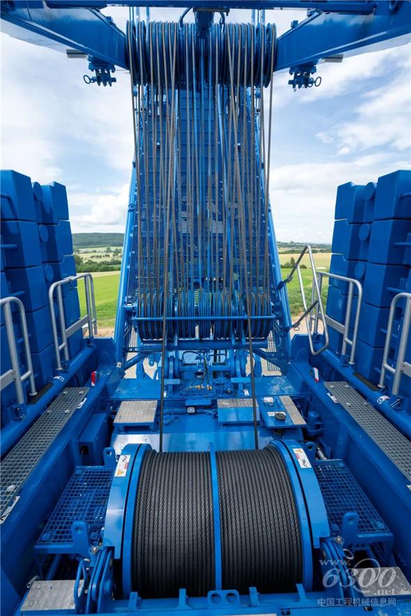 “可变超起配重和V-型架允许我们在整个风机安装过程中带60吨的超起配重工作。所以我们不需要花费时间去处理配重的事情。”大量的配重只在扳起或放倒桁架臂时才用到。顺便说下,可以扳起的桁架臂达到198米这一惊人的长度。只需要4个销子,整个过程大约10分钟-总重375吨的配重就已经悬挂在超起臂上了。