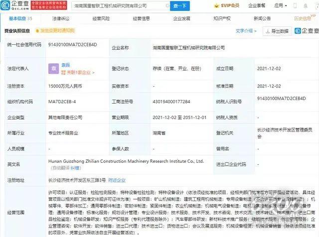 12月2日,湖南国重智联工程机械研究院有限公司成立,注册资本1.5亿。企查查股权穿透显示,该公司由中联重科、山河智能、三一重工、铁建重工等共同持股。