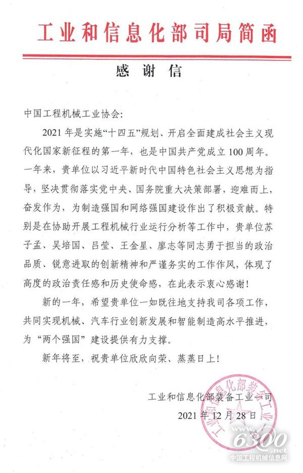 近日,工业和信息化部装备工业一司致函中国工程机械工业协会,对协会一年来,坚持以习近平新时代中国特色社会主义思想为指导,坚决贯彻落实党中央、国务院重大决策部署,迎难而上,奋发作为,在制造强国和网络强国建设工作,特别是积极配合协助开展工程机械行业运行分析等工作表示感谢!以下为感谢信全文: