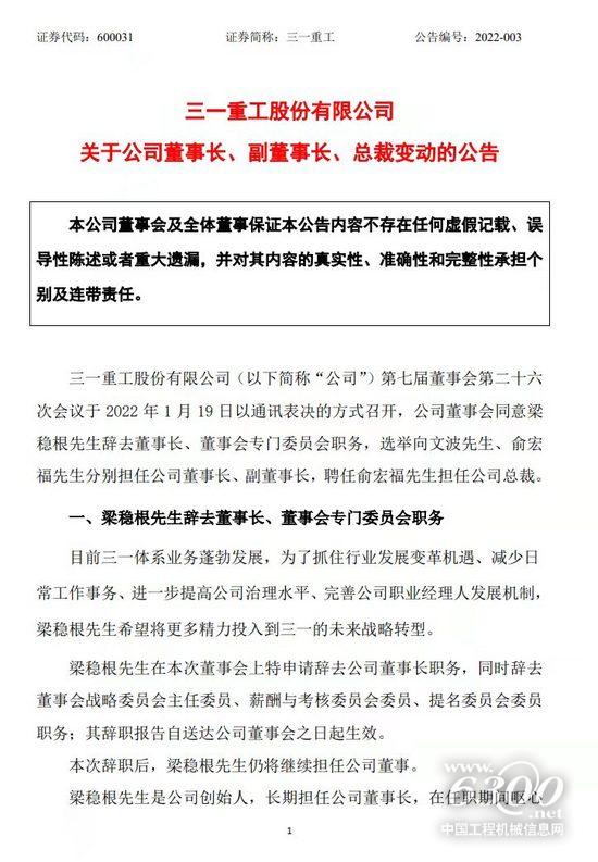 三一重工公告表示,作为实控人、董事,梁稳根仍将高度参与和关注三一重工的发展,集中更多精力考虑公司的长期战略和发展机遇。
