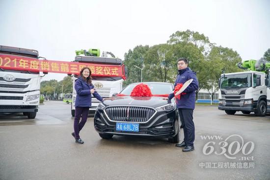 在一片热烈喜庆的氛围中,中联重科混凝土机械营销公司副总经理张良、 一汽解放青岛汽车有限公司专用车部销售经理韩明浩为冠亚季军,颁发红旗H5轿车、解放皮卡、2万元加油充值卡等大奖,以表彰先进树立典型,激励一线将士虎年再创辉煌。