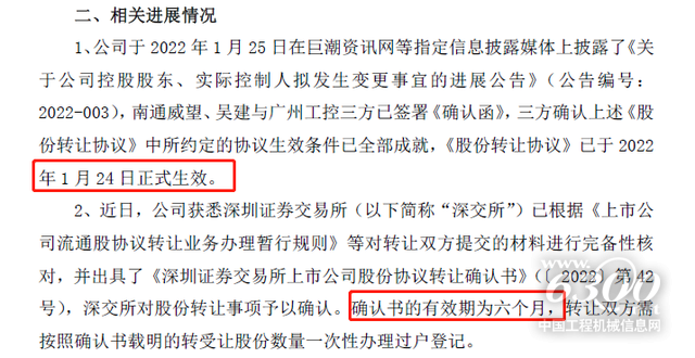 今年1月下旬,润邦股份披露,前述《股份转让协议》于1月24日正式生效。3月7日下午,上市公司披露,深交所已对股份转让事项予以确认。确认书有效期为六个月,转让双方需按照确认书载明的转受让股份数量一次性办理过户登记。