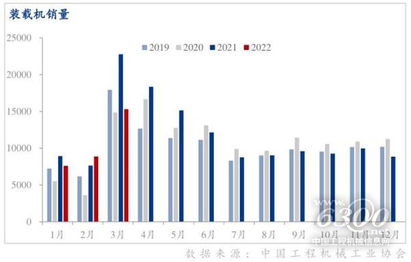 2022年3月销售各类装载机15309台,同比下降32.8%。其中国内市场销量11399台,同比下降38.8%;出口销量3910台,同比下降5.81%。2022年1-3月,共销售各类装载机31789台,同比下降19.2%。其中国内市场销量21185台,同比下降30.8%;出口销量10604台,同比增长21.5%。