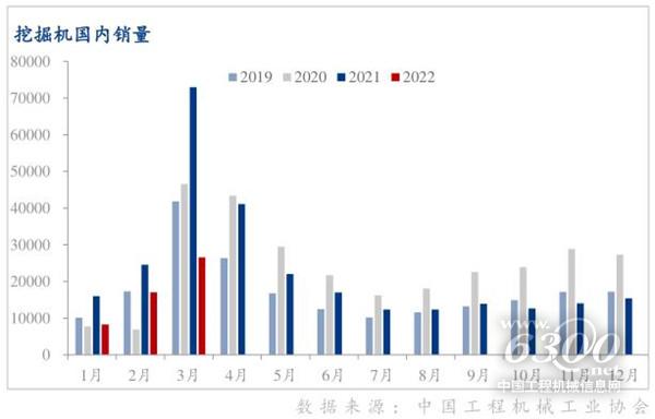 据中国工程机械工业协会对26家挖掘机制造企业统计,2022年3月销售各类挖掘机37085台,同比下降53.1%;其中国内26556台,同比下降63.6%;出口10529台,同比增长73.5%。2022年1-3月,共销售挖掘机77175台,同比下降39.2%;其中国内51886台,同比下降54.3%;出口25289台,同比增长88.6%。