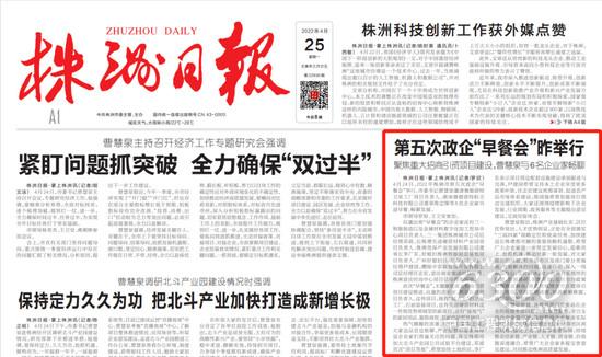 4月24日,株洲市第五次政企“早餐会”上,曹慧泉书记还邀请三一集团株洲城市公司负责人等共进早餐,畅聊项目建设情况,听取他们提出的意见建议。