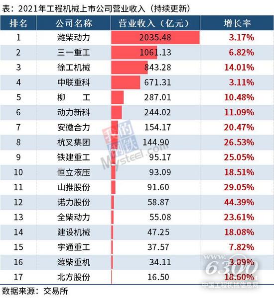 17家工程机械企业公布2021年业绩,潍柴、三一分列营收和净利第一