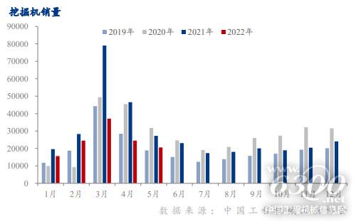 6月8日,中国工程机械工业协会发布的26家挖掘机制造企业统计数据显示, 2022年5月销售各类挖掘机20624台,同比下降24.2%;其中国内12179台,同比下降44.8%;出口8445台,同比增长63.9%。1-5月,共销售挖掘机122333台,同比下降39.1%;其中国内80097台,同比下降54.7%;出口42236台,同比增长75.7%。