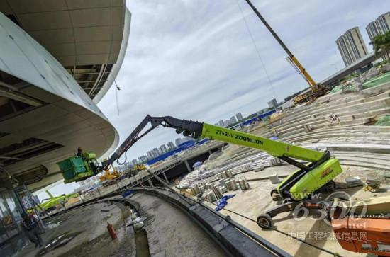 截至目前,海口国际免税城的造型屋面已完成施工,机电设备进入调试阶段,目前现场工人正加紧进行外立面幕墙、机电安装、室外园林景观及室内精装等专业施工。在现场,各系列中联重科智能高机汇聚一堂,包括26米—58米段的直臂式高空作业平台,以及6米—10米的剪叉式高空作业平台,它们正深度参与免税城的幕墙顶棚安装、建筑内装等各项作业,施工表现游刃有余。