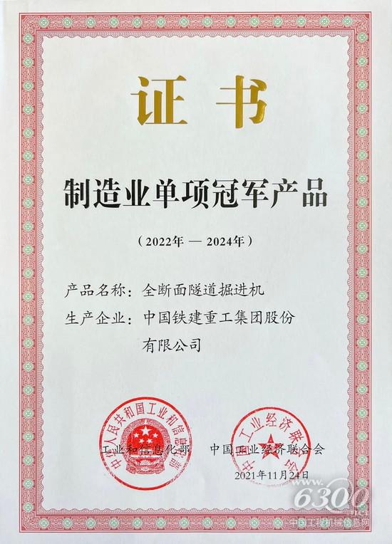 近日,国家工信部、中国工业经济联合会颁发了第三届制造业单项冠军产品复核通过的新证书。作为2019-2021年的单项冠军产品,铁建重工全断面隧道掘进机经过行业和市场的三年考验,成功获批继续保持这一行业冠军殊荣。这也代表着铁建重工在全断面隧道掘进机这一细分产品领域持续稳居市场和技术全球前列,彰显“中国制造”排头兵的强劲实力。
