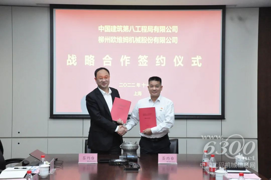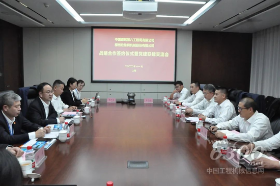 11月19日,中建八局与柳工欧维姆公司党建联建交流会暨战略合作签约仪式在中建八局总部举行。柳工欧维姆公司董事、副总经理陈昱鹏、中建八局总工程师亓立刚进行深入交流会谈,并见证双方签约。