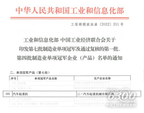近日,国家工信部、中国工业经济联合会发布第七批国家级制造业单项冠军名单,三一汽车起重机械有限公司生产的汽车起重机榜上有名。