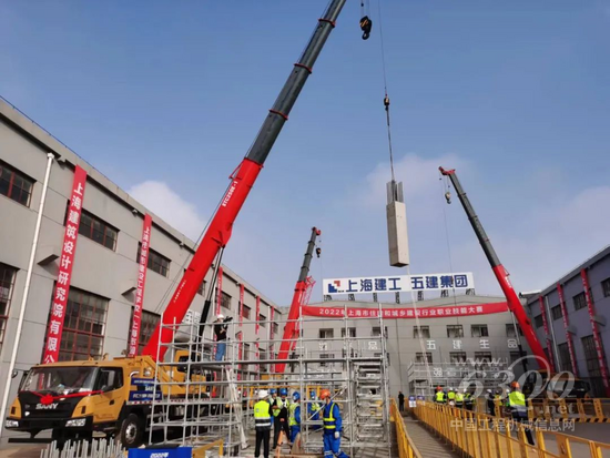 参加此项比赛的共9支队伍,每支队伍7人,其中3名辅助工,他们需要在4个小时内成功搭设一栋整体装配式框架结构的工法楼。选手们从构件吊装准备、引导就位到安装校正,有条不紊地操作着。一旁的3台三一起重机高举大臂,与他们紧密配合。