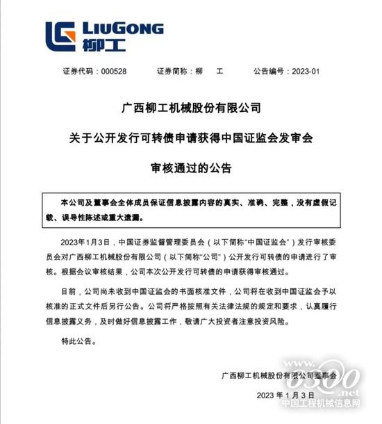柳工1月3日公告,当日,中国证监会发行审核委员会对公司公开发行可转债的申请进行了审核。根据会议审核结果,公司本次公开发行可转债的申请获得审核通过。根据公司此前公告,本次公开发行可转换公司债券募集资金总额不超过30亿元(含30亿元),扣除发行费用后,募集资金净额拟投入以下项目:柳工挖掘机智慧工厂项目、柳工装载机智能化改造项目、中源液压业务新工厂规划建设项目、工程机械前沿技术研发与应用项目、补充流动资金。