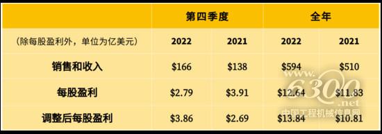2022年第四季度销售和收入为166亿美元,较2021年第四季度的138亿美元增长20%。2022年第四季度每股盈利为2.79美元,而2021年第四季度每股盈利为3.91美元。2022年第四季度调整后每股盈利为3.86美元,而2021年第四季度调整后每股盈利为2.69美元。2022年第四季度每股盈利中,包括其他收入(支出)中工程机械、能源和交通业务板块每股0.41美元的不利外汇影响,主要与资产负债表折算有关,而2021年第四季度的有利影响为每股0.01美元。