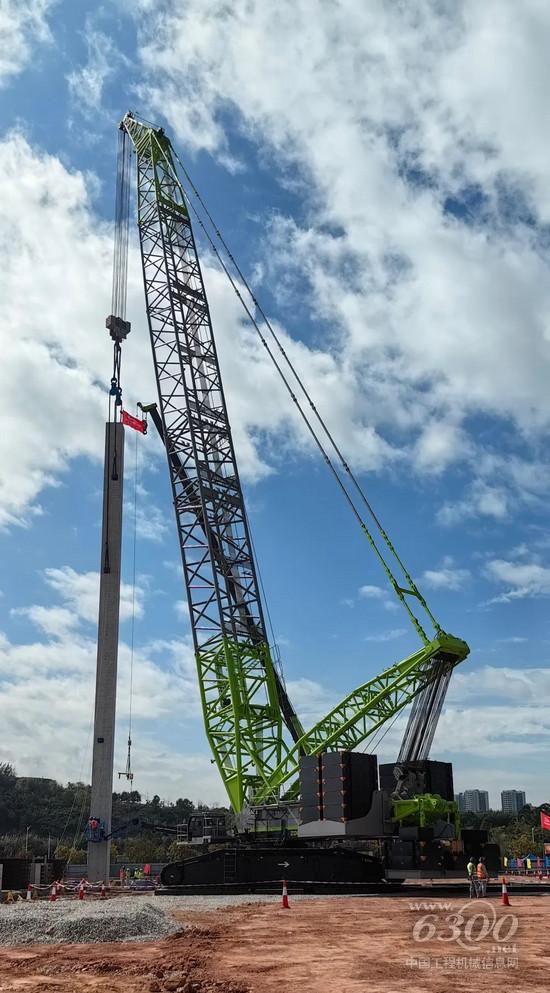 ▲中联重科履带起重机吊装亚洲最大立体库预制柱