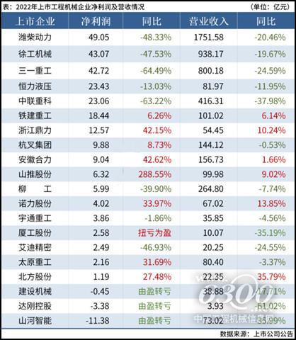 据不完全统计截至4月30日,共有20家工程机械行业上市企业公布2022年经营业绩,合计营收达5161.08亿元,合计实现净利润为244.66亿元,17家企业实现盈利。