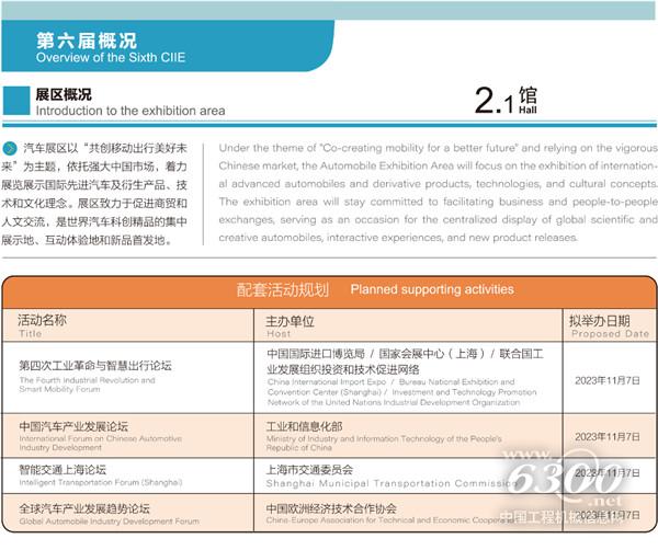 第六届中国国际进口博览会(以下简称进博会)将于2023年11月5日至10日在国家会展中心(上海)举行,进博会作为全球首个以进口为主题的国际级展会,以其独特的魅力,吸引着众多行业的专业人士积极参与。而对于工程机械行业的专业人士而言,进博会无疑是一个难得的展示平台和交流机会。据中国工程机械信息网(ycsqzl88.com)获悉,汽车展区以“共创移动出行美好未来”为主题,依托强大中国市场,着力民览展示国际先进汽车及衍生产品、技术和文化理念。展区致力于促进商贸和文交流,是世界汽车科创精品的集中展示地、互动体验地和新品首发地。届时,汽车展区将举办“第四次工业革命与智慧出行论坛” 、“中国汽车产业发展论坛”、“智能交通上海论坛”、“全球汽车产业发展趋势论坛”等重大活动。