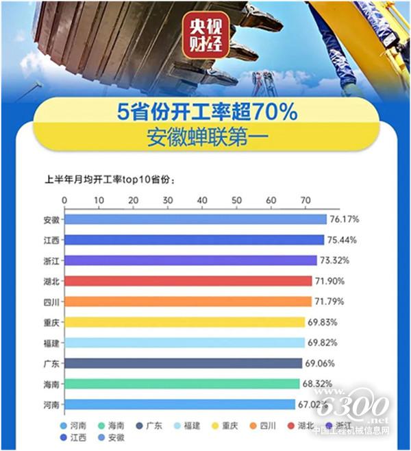 央视财经打造的“央视财经挖掘机指数”近日发布了最新相关数据。今年上半年我国各地重大项目扎实推进,稳步推进经济高质量发展,多个省份成绩亮眼。上半年,31个省份中5个省份开工率均超过70%,19省份开工率均超过60%。单月开工率前三为安徽、江西、浙江,其中,安徽已连续5个月开工率全国第一。