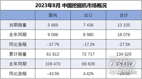 据中国工程机械工业协会对挖掘机主要制造企业统计,2023年8月销售各类挖掘机13105台,同比下降27.5%,其中国内5669台,同比下降37.7%;出口7436台,同比下降17.2%。