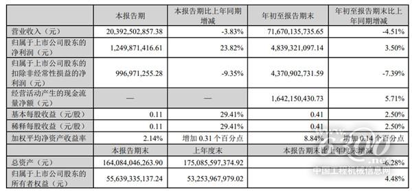 前三季度,徐工机械实现营业收入716.7亿元,同比下降4.51%,其中第三季度203.9亿元,同比下降3.83%,降幅较上半年有所收窄。