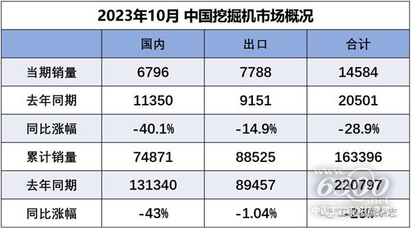 据中国工程机械工业协会对挖掘机主要制造企业统计,2023年10月销售各类挖掘机14584台,同比下降28.9%,其中国内6796台,同比下降40.1%;出口7788台,同比下降14.9%。