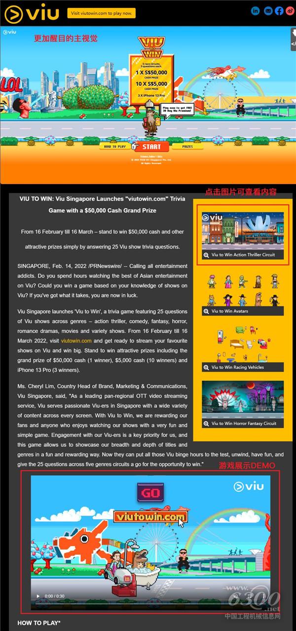 这是企业发布新闻的基础价值,能够提供关键信息,让受众阅读新闻。但此外新闻稿还有一个价值是,它是一个沟通契机,就像一个“窗口”一样,可以在提供新闻的同时,融入更加丰富的企业信息供受众了解,从而达成更为深度的沟通,这就是从“阅读新闻信息”升级至心智上的“感受企业新闻”。举一些场景案例,你会发现这确实存在着刚需。||| Case1第一个典型场景是,每当企业有非常重要或信息量较多的新闻时,文字内容对于体现新闻全貌是有一定实操难度的。因为PR很容易写到篇幅过长,从而淹没重点;或者想介绍的产品等内容是抽象的、机制很复杂的,很难用文字体现,从而增加受众的阅读理解成本。此时就可以考虑在文字之余,在一篇新闻稿中增加多级页面,插入更多的解读图片或视频等素材,这样不仅能增加单篇新闻的信息容量,还能使之看起来更加整洁与美观。比如下面这个案例来自东南亚的视频流媒体Viu,该企业近期推出了一款小游戏,以期邀请用户参与、提升粘性。品牌为了推广游戏就需要发布新闻触达用户,并为媒体报道提供官方信息与相关素材。分析下品牌在这篇新闻稿中的难点是:“游戏”是重视觉呈现与实际操作的内容,很难用文字展示其独特体验;同时这篇新闻包含了游戏玩法,参与奖励等内容,信息量很大。此时显然就适合将这篇新闻稿有逻辑的划分板块,比如有可视化的素材来辅助呈现游戏内容,同时有专门的视频素材来介绍游戏体验与参与奖励。故此,“多媒体新闻”就成为了首选,下图就是该新闻专页的最终呈现: