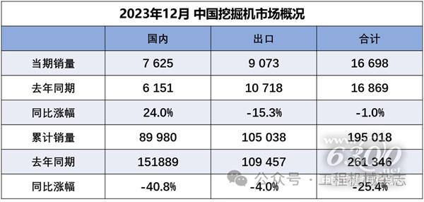 据中国工程机械工业协会对挖掘机主要制造企业统计,2023年12月销售各类挖掘机16698台,同比下降1.01%,其中国内7625台,同比增长24%;出口9073台,同比下降15.3%。