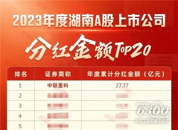 据悉,自2000年公司上市以来,中联重科一贯重视股东回报,在可持续发展的前提下实行持续、稳定的利润分配政策,截至2023年12月31日,累计现金分红235亿元,历史整体分红率约为42%,长时间处于行业领先水平。近日,中联重科荣登2023年度湖南A股上市公司分红榜榜首,彰显公司回报股东、提升投资者获得感的责任担当。