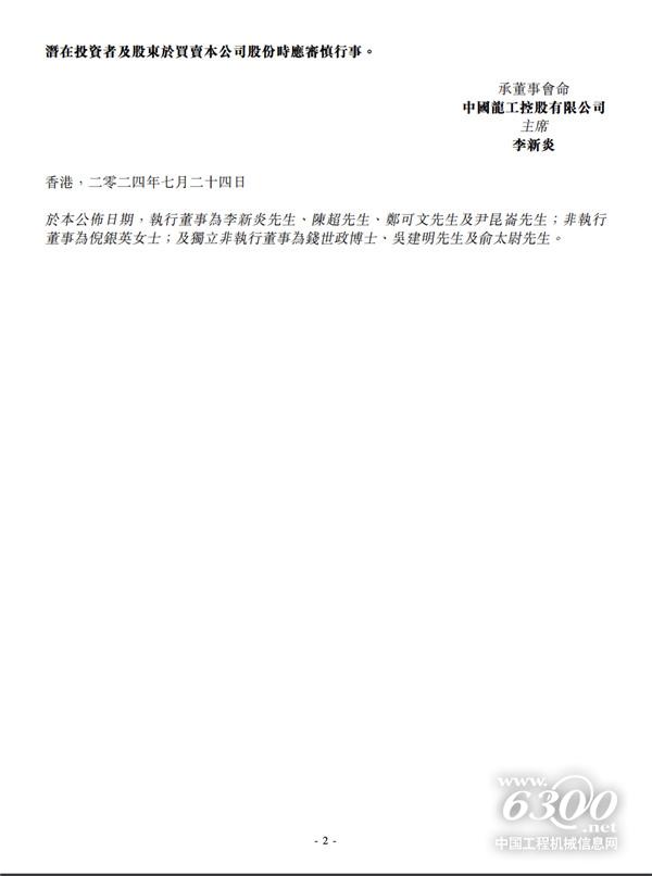 7月24日,中国龙工控股有限公司发布正面盈利预告。数据显示:2024年上半年纯利润将大幅增加,纯利润为4.10亿~4.61亿元(2023年同期净利润3.5亿港元),相较2023年同期增加33%~50%。