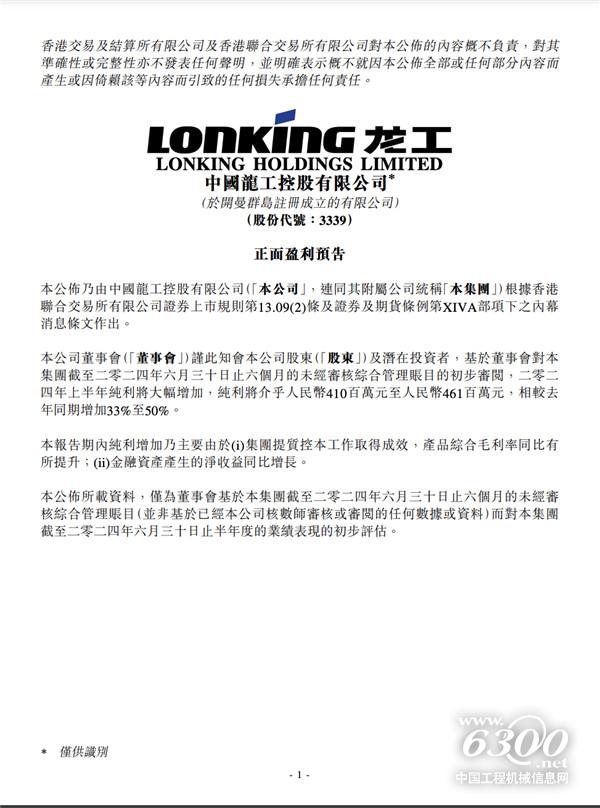 本公布由中国龙工控股有限公司(以下简称“本公司”,连同其附属公司统称“本集团”)根据香港联合交易所有限公司证券上市规则第13.09(2)条及证券及期货条例第XIVA部项下之内幕消息条文作出。本公司董事会谨此知会本公司股东及潜在投资者,基于董事会对本集团截至2024年6月30日止6个月的未经审核综合管理账目的初步审阅,2024年上半年纯利润将大幅增加,预计纯利润为4.10亿~4.61亿元,相较2023年同期增加33%~50%。本报告期内纯利润增加主要由于(i)集团提质控本工作取得成效,产品综合毛利率同比有所提升;(ii)金融资产产生的净收益同比增长。本公布所载资料,仅为董事会基于本集团截至2024年6月30日止6个月的未经审核综合管理账目(并非基于已经本公司核数师审核或审阅的任何数据或资料)而对本集团截至2024年6月30日止半年度的业绩表现的初步评估。
