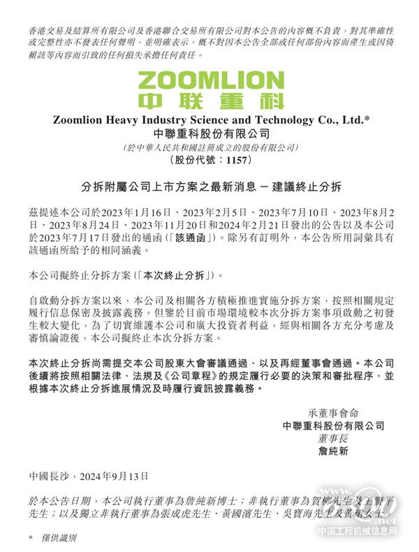 对于终止分拆,中联重科表示,不会对公司现有业务及财务状况产生重大不利影响,也不影响公司未来战略规划。