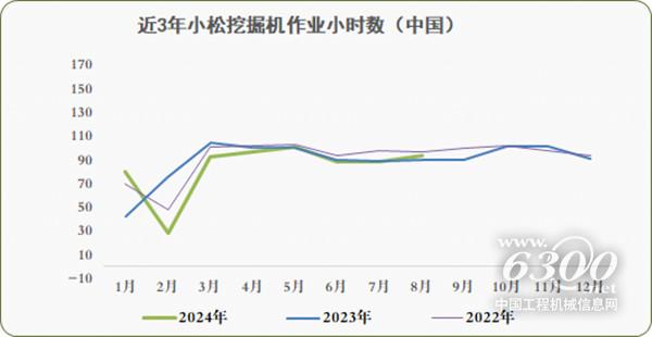 2024年8月小松挖掘机开工小时数为93.0小时,同比增长3.3%。