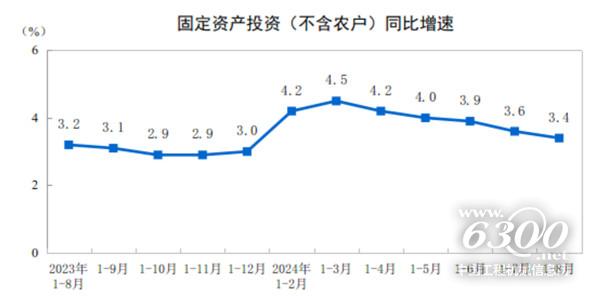 2024年1—8月份,全国固定资产投资(不含农户)329385亿元,同比增长3.4%(,其中,民间固定资产投资167911亿元,下降0.2%。从环比看,8月份固定资产投资(不含农户)增长0.16%。