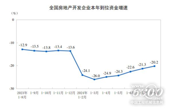 1—8月份,房地产开发企业房屋施工面积709420万平方米,同比下降12.0%。其中,住宅施工面积496052万平方米,下降12.6%。房屋新开工面积49465万平方米,下降22.5%。其中,住宅新开工面积35909万平方米,下降23.0%。房屋竣工面积33394万平方米,下降23.6%。其中,住宅竣工面积24393万平方米,下降23.2%。1—8月份,房地产开发企业到位资金69932亿元,同比下降20.2%。其中,国内贷款10229亿元,下降5.1%;利用外资20亿元,下降42.4%;自筹资金25150亿元,下降8.4%;定金及预收款21078亿元,下降30.2%;个人按揭贷款9920亿元,下降35.8%。
